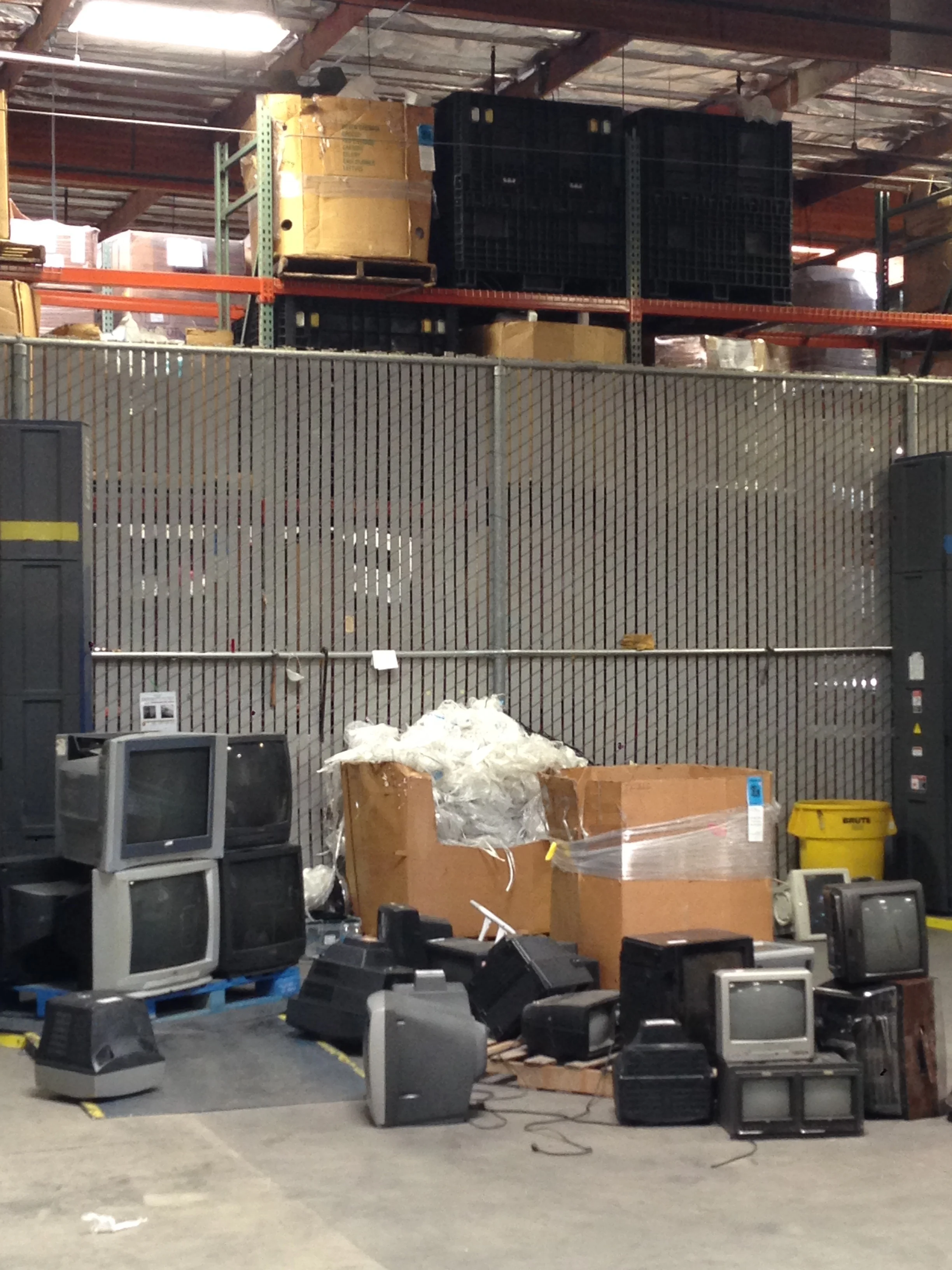 One of the most frequently donated items are TVs which are either sold at a store or taken apart and sold for parts by people employed by Goodwill. Old TVs were gutted and then outfitted to hang as a lighting chandelier at the entrance of the store.