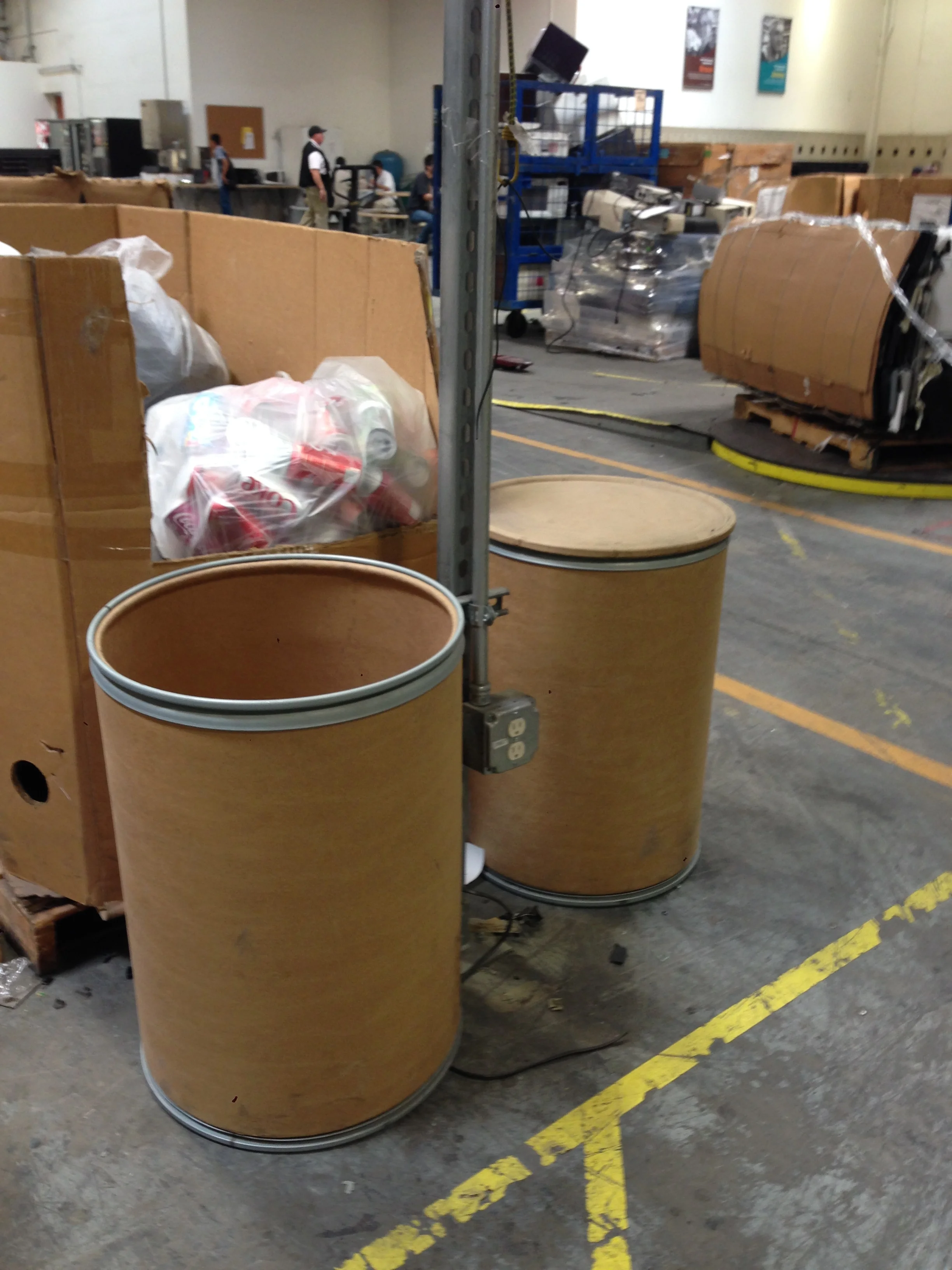 When smaller items get donated, they get organized and stored in cardboard drums at the Goodwill facility. Drums were customized to have a powder coated metal panel on top to create a clean and sturdy surface for product to be displayed. Theses became the "hero" item displays and provided multiple heights and layers with which to work.