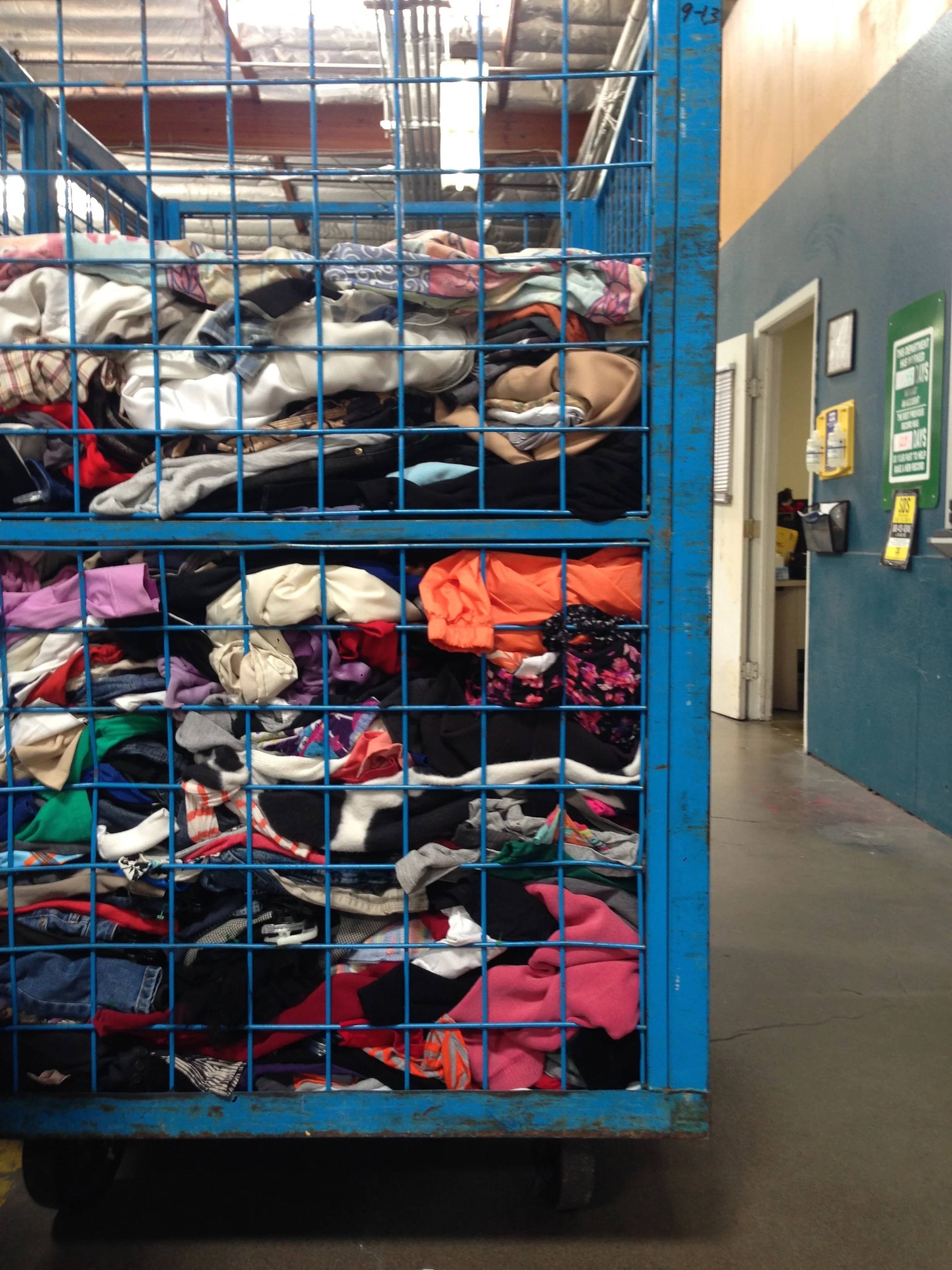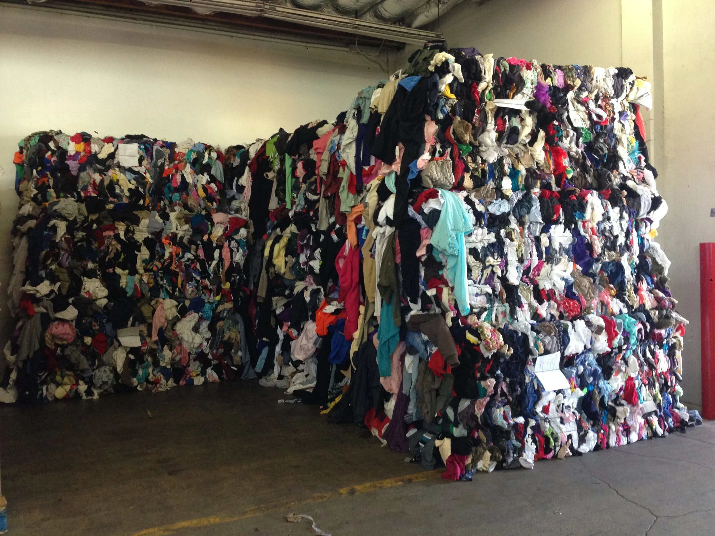 Any clothing deemed unsellable after it's been donated is collected and ran through a machine that creates a giant bale of clothing that then gets recycled. Originally the intent was to create the long cash wrap to look like a bale of solid clothing, but due to fire regulations, the design had to be adapted.